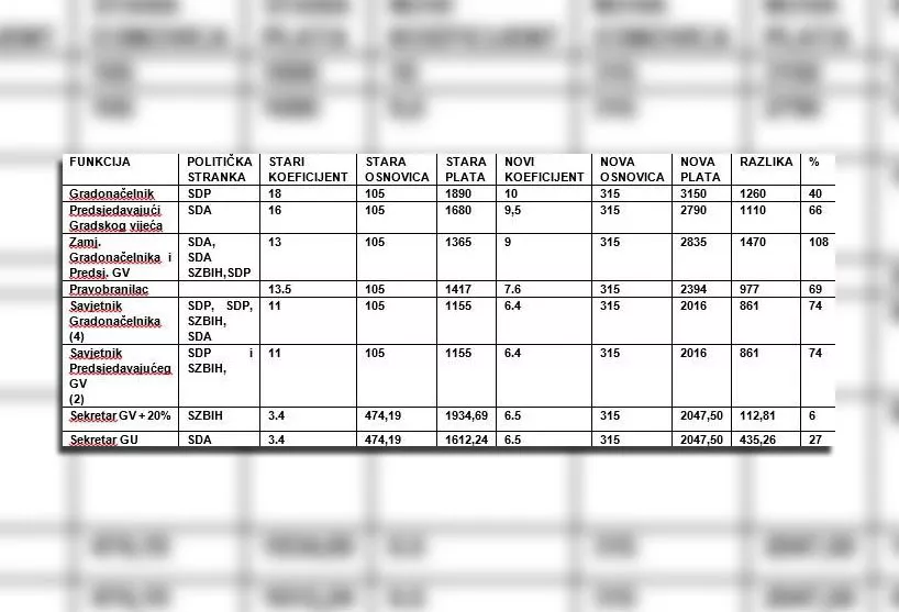 U tabeli pogledajte pregled važećih koeficijenata za obračun plata funkcionera i državnih službenika. Također u tabeli su navedeni koeficijenti za obračun plata koji se predlažu kao i povećanje koje bi primjena takvih koeficijenata proizvela. Povećanje je prikazano i u nominalnom iznosu i u postotku u odnosu na postojeću platu, stoji u saopćenju Sindikalne organizacije organa Grada Sarajeva.