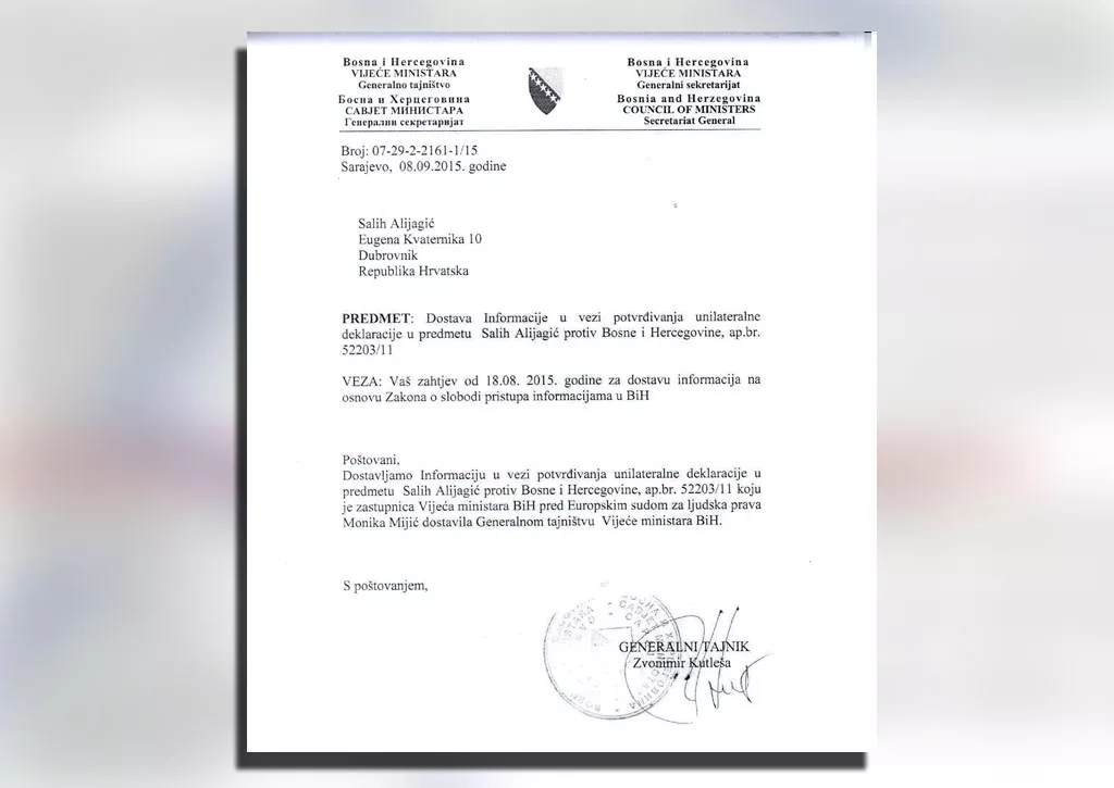U predmetu Salih Alijagić protiv BiH, prema ovoj tužbi, Alijagiću je nanesena šteta od najmanje 1,2 miliona KM. Naime, Monika Mijić je Evropskom sudu za ljudska prava predložila usvajanje Unilaterale deklaracije, dokumenta koji je navodno prihvaćen od Vijeća ministara prije ravno godinu dana. Nakon provjere advokata Ademovića, vidjelo se da Vijeće ministara nije odobrilo ovu deklaraciju, niti je raspravljalo na tu temu. Zastupnica Mijić je po ovoj tužbi ponudila pogrešan obračun glavnice duga i kamata, koji je morala podmiriti Republika Srpska. U tužbi se tvrdi da je Mijić pogodovala vlastima u RS-u, a protiv Alijagića. Dakle, nije imala ovlaštenja od Vijeća ministara za nagodbu, niti se smjela konsultovati samo sa Republikom Srpskom, tačnije Ministarstvom finansija RS.
