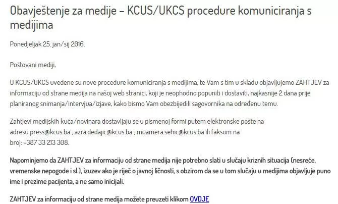 Postavlja se pitanje, šta nakon 16 sati do narednog dana ujutro u 8 sati kada se nažalost događaju brojne nesreće zbog kojih novinari su uvijek do sada, bez obzira ko je bio direktor UKCS-a, pravovremeno dobijali informacije od uposlenika u Službi za odnose sa javnošću.