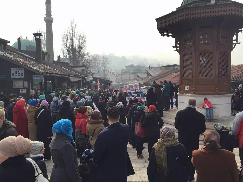Nekoliko stotina građana, među kojima najveći broj žena, okupilo se u 12,30 sati ispred Sebilja na Baščaršiji. Oni će prošetati do BBI Centra gdje će se u 14 sati i završiti ovo okupljanje. Ovom protestnom šetnjom učesnici žele skrenuti pažnju na probleme zabrane nosenja hidžaba, a posebno u svjetlu zadnje odluke VSTV-a.