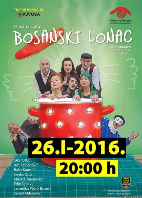 Teatar komedije „Rajvosa“ i Javna ustanova Centar za kulturu Sarajevo, čiji je osnivač Općina Centar, večeras u 20 sati izvest će komediju „Bosanski lonac“, saopćeno je iz Općine Centar, prenosi novinska agencija Patria.