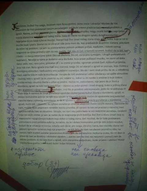 Srđan Miljković, predsjednik Skupštine stanara u jednoj novosadskoj zgradi, napisao je pismo vlasnici stana u toj zgradi, kako bi se žalio na ponašanje njenih podstanara. Umjesto odgovora dobio je ispravljen pravopis i ocjenu kao u školi, prenosi novinska agencija Patria.