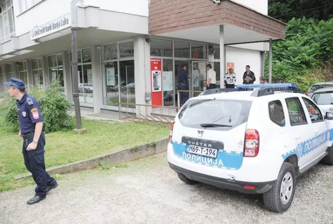 U pljački Unicredit banke u Kotor Varošu učestvovala su najmanje četiri maskirana razbojnika, koji su se pred banku dovezli u ukradenom automobilu Reno senik.
