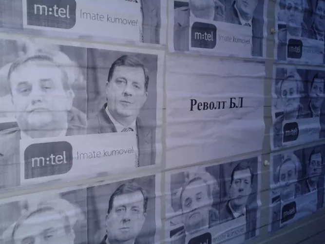 Na plakatima koje potpisuje "Revolt BL" prikazani su likovi Mile Radišića i Milorada Dodika uz potpis “Imate kumove!”.