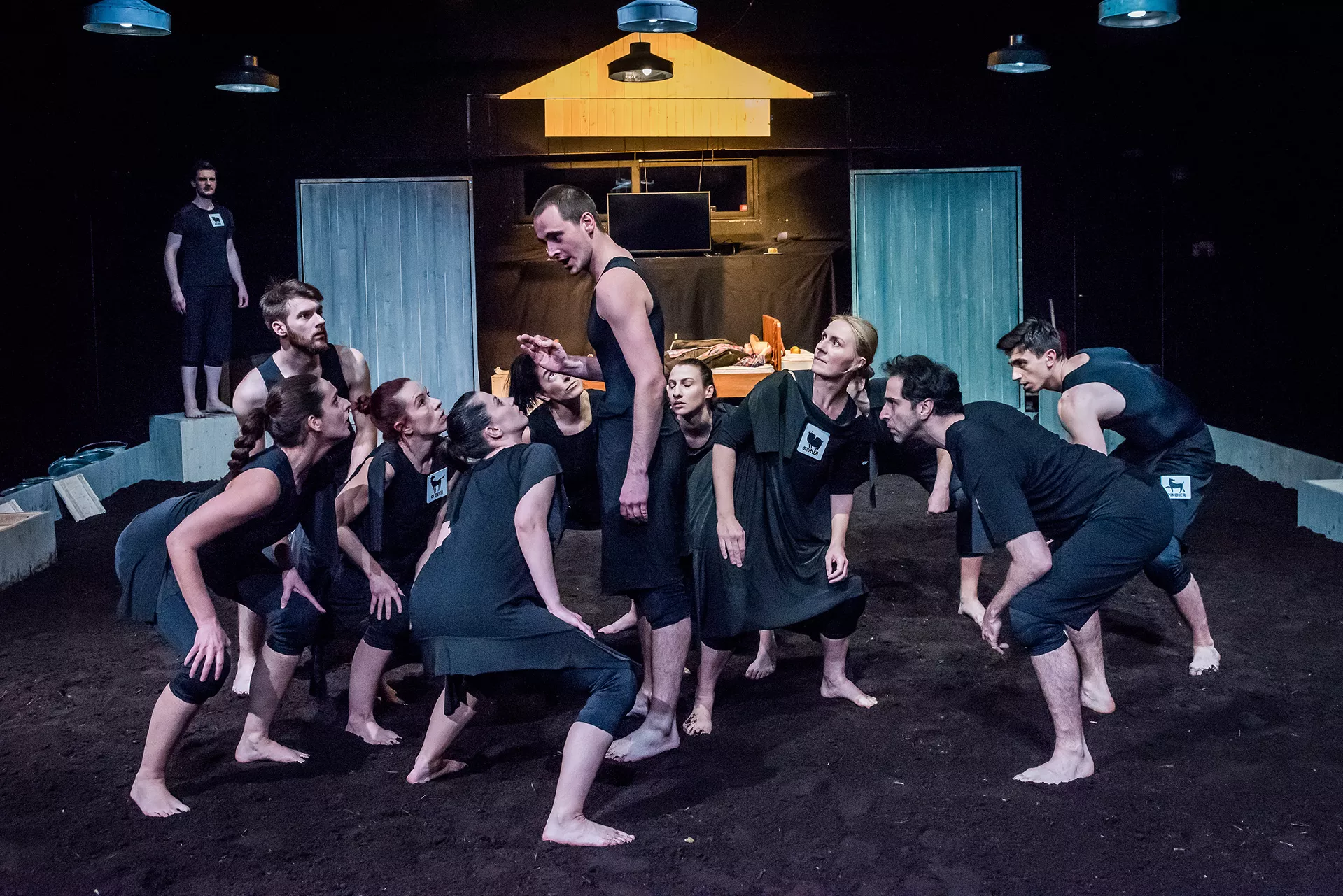 Predstava zapravo počinje tako što publika odlučuje ko će da glumi koju ulogu. To se realizira tako što se svaki izvođač predstavi publici i kaže zašto smatra da bi bio idealan za tu ulogu, a publika pomoću zvona dodijeljenih na ulazu ispoljava svoju podršku ili negodovanje. Jačina zvuka svih tih simultano odjekujućih zvona se mjeri decibelometrom, a najglasnija buka osigurava dodjelu uloge. Zvona su minijaturne verzije kravljih zvona, i publika se već zvukom uvodi u ambijent životinjske farme. Scena je autentična i izvrsna u svojoj jednostavnosti- glumci su sve vrijeme u blatu.