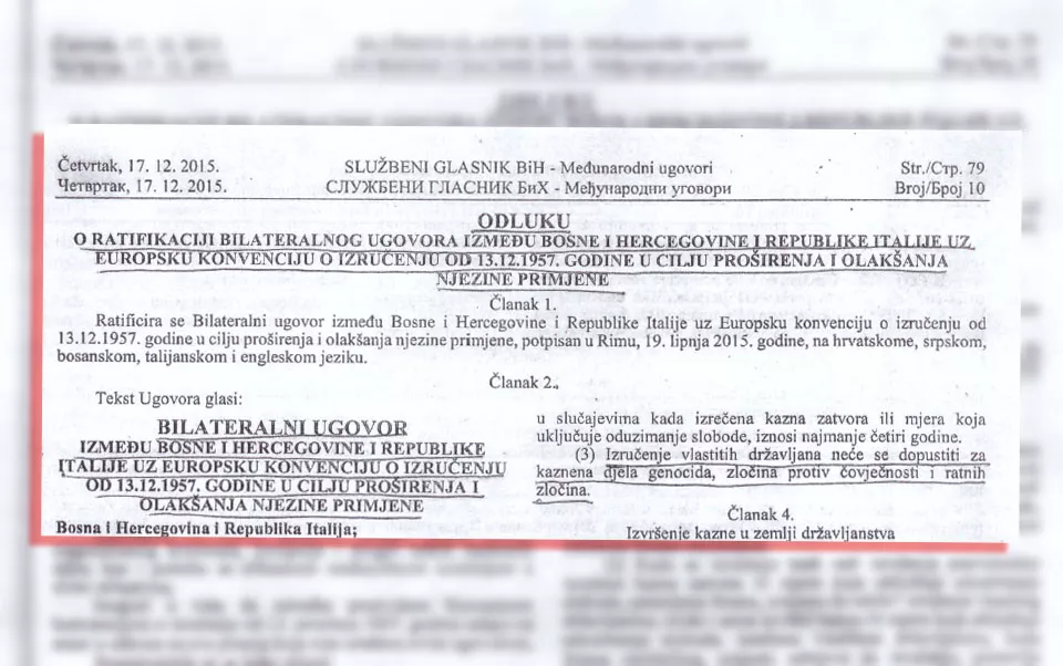 Advokati drže važnim da je za odlučivanje u ovom predmetu važan Ugovor od 28.10.2015. godine između BiH i Republike Italije uz Konvenciju o izručenju od 13.12.1957. godine u cilju proširenja i olakšanja njezine primjene, objavljen u Službenom glasniku BiH - međunarodni ugovori od 17.12.2015 godine. Iz sadržaja Ugovora proizilazi da su ugovorne strane međusobno olakšale provođenje Konvencije o izručenju, te dogovorile za koja krivična djela se imaju isporučiti vlastiti građani da bi im se sudilo ili da bi kaznu izdržali kod druge ugovorne strane. Pri tome je dogovoreno da se neće isporučivati vlastiti građani za krivična djela genocida, zločina protiv čovječnosti i ratnih zločina.