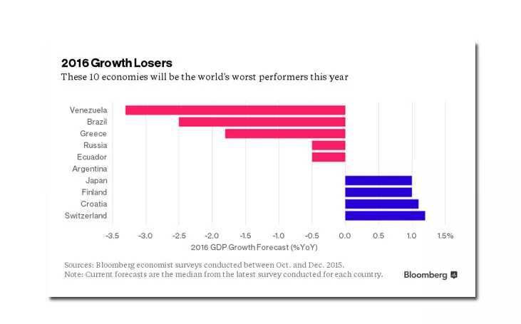 Mnogim ekonomijama u svijetu 2016. godina će donijeti samo još više razočaranja, saglasni su ekonomisti. Među prvih 10 zemalja koje će imati najgore privredne pokazatelje za pad u recesiju našla se i Republika Hrvatska, prenosi novinska agencija Patria.