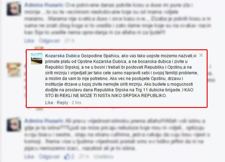 Izvjesni korisnik ove društvene mreže, koji se potpisao kao „Kozarska dubica“ rekao je da bi Spahić moga zapasti u probleme, kao i njegova porodica, ako ne bude poštovao Republiku Srpsku, piše bh. novinska agencija Patria.