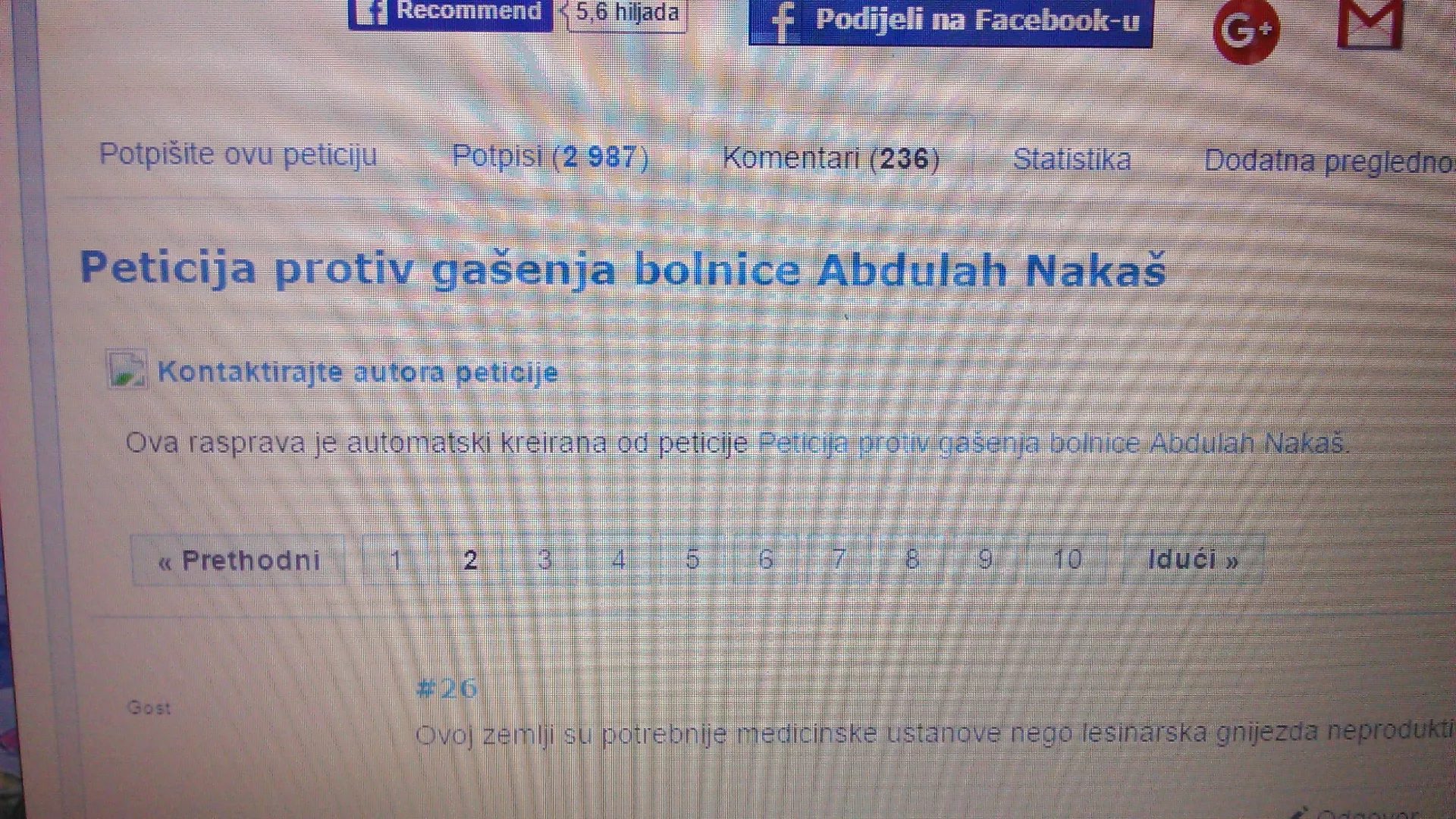 Na stranici onlinepeticija.com pokrenuta je peticija protiv gašenja bolnice Opće bolnice "Prim.dr. Abdulah Nakaš" koju je već potpisalo više od 3.000 ljudi, piše bh. novinska agencija Patria.