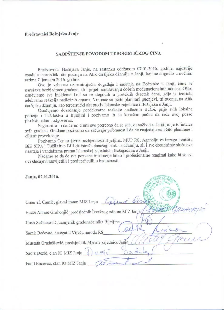 U povodu terorističkog napada na Atik džamiju u Janji koji se desio rano jutros, glavni imam MIZ-Janja Omer ef. Camić sazvao je vanrednu sjednicu IO MIZ-Janja na kojoj su prisustvovali predsjednik MZ Janja, delegat u Vijeću naroda RS i dogradonačelnik grada Bijeljina, te su izdali saopćenje za javnost, prenosi novinska agencija Patria.