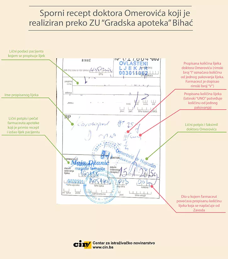 Novinari CIN-a su u posjedu dva Omerovićeva recepta na kojima je dopisana veća količina lijekova od one koju on prvobitno propisao. U prvom receptu je propisao jedno pakovanje lijeka, a u apoteci „Europharm“ je dodano još jedno pakovanje. Prema Izvještaju Komisije, u apotekama „Europharm“ i „Kovačević“ realizirano je 59 od 86 Omerovićevih spornih recepata.