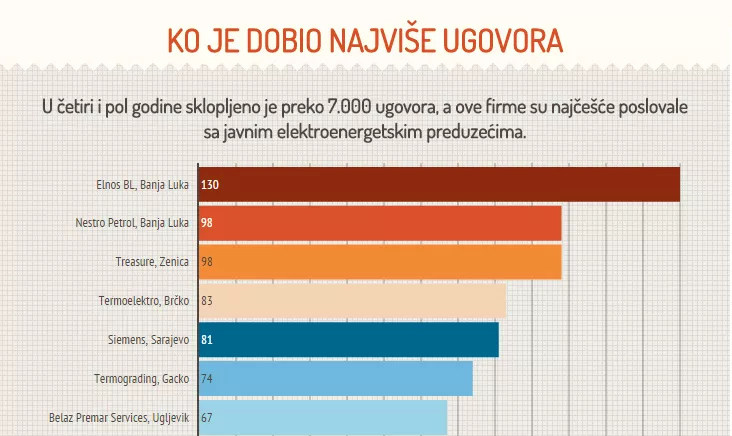 U četiri i po godine sklopljeno je preko 7.000 ugovora, a najviše poslova dobile su firme: „Elnos BL“ i „Nestro Petrol“ iz Banje Luke, „Treasure“ iz Zenice i „Termoelektro“ iz Brčkog. S druge strane, neka preduzeća su imala manji broj ugovora, ali su bila vrednija s obzirom na postignutu cijenu, kao što je slučaj sa „Rudnapom“ iz Banje Luke. Ova firma je na osnovu dva ugovora ostvarila prihod od 212,2 miliona KM, poslujući sa „Elektroprivredom HZHB“.