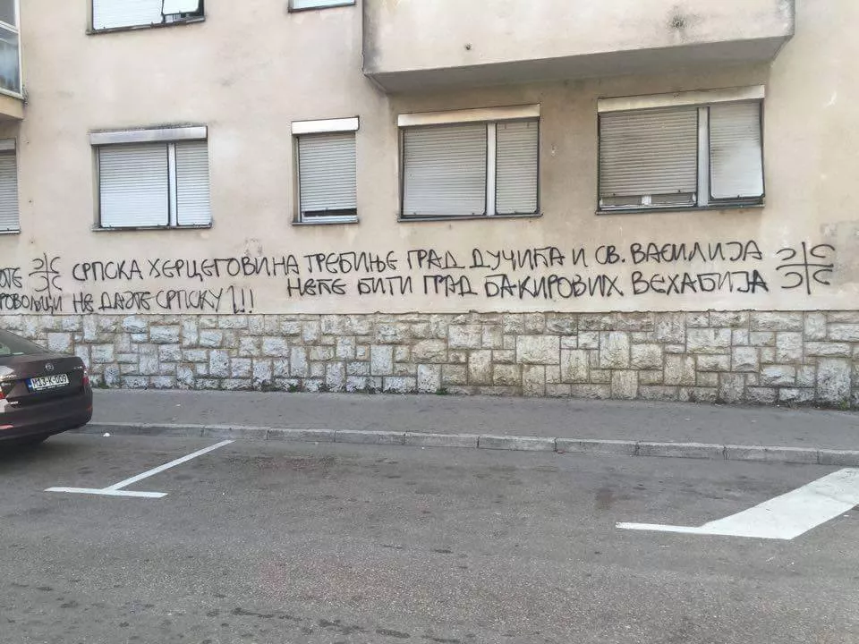 „Srpski dobrovoljci ne daju Srpsku! Srpska Hercegovina Trebinje grad Dučića i sv. Vasilija, neće biti grad Bakirovih vehabija!“ grafit je koji vrijeđa osjećanja svih Bošnjaka koji su se vratili na svoja ognjišta.