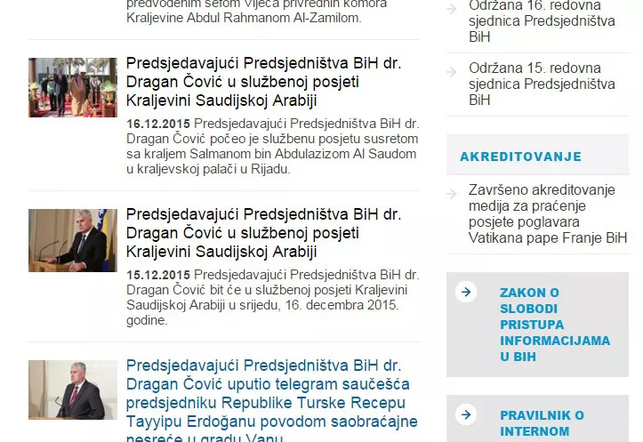 Podsjećamo, poglavar Katoličke crkve papa Franjo boravio je u pastoralnoj posjeti Bosni i Hercegovini 6. Juna, a sada u decembru na oficijelnoj stranici Predsjedništva “ažurni” službenici ove institucije još uvijek nisu uklonili obavještenje da je završeno akreditiranje novinara za ovu posjetu.
