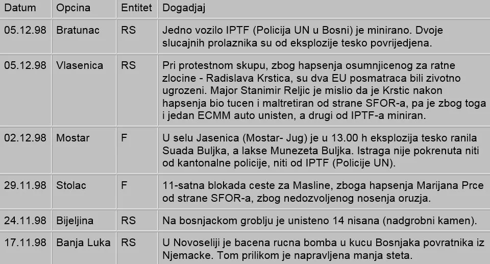 Ovo je samo dio podataka o napadima na povratnike Bošnjake, koje je sačinila jedna strana organizacija, pozivajući se, uglavnom, na podatke IPTF i UNPROFOR-a, piše bh. novinska agencija Patria. Neki od napada na povratnike, naročito oni manji, nisu evidentirani.