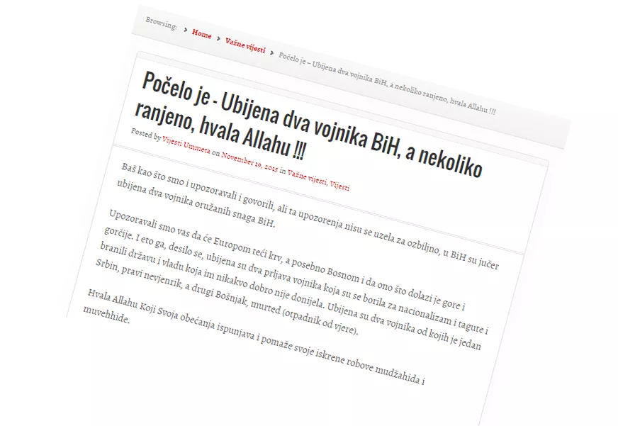 Upozoravali smo vas da će Europom teći krv, a posebno Bosnom i da ono što dolazi je gore i gorčije. I eto ga, desilo se, ubijena su dva prljava vojnika koja su se borila za nacionalizam i tagute i branili državu i vladu koja im nikakvo dobro nije donijela. Ubijena su dva vojnika od kojih je jedan Srbin, pravi nevjernik, a drugi Bošnjak, murted (otpadnik od vjere).