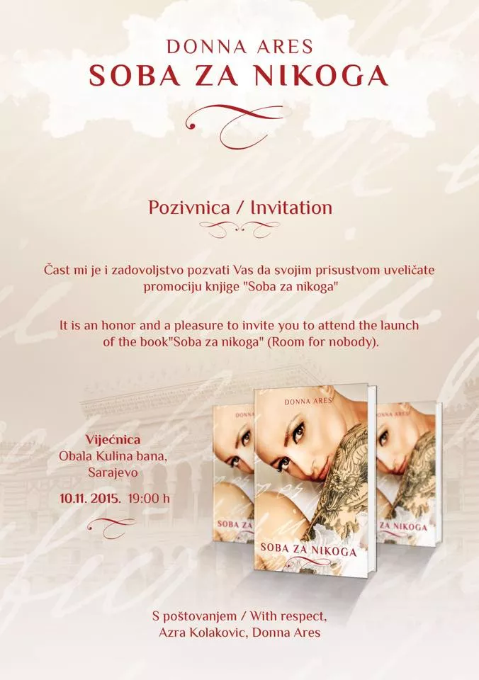 Večeras će u svečanoj sali sarajevske Vijećnice sa početkom u 19 sati biti održana promocija knjige "Soba za nikoga", autorice Donne Ares, piše novinska agencija Patria.
