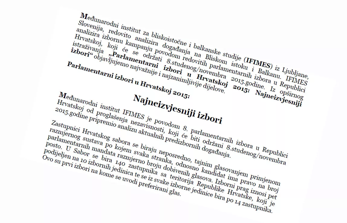 Zastupnici Hrvatskog sabora se biraju neposredno, tajnim glasovanjem primjenom razmjernog sustava po kojem svaka stranka, odnosno kandidat ima pravo na broj parlamentarnih mandata razmjerno broju dobivenih glasova. Izborni prag iznosi pet posto. U Sabor se bira 140 zastupnika sa teritorija Republike Hrvatske, koji je podijeljen na 10 izbornih jedinica te se iz svake izborne jedinice bira po 14 zastupnika. Ovo su prvi izbori na kome se uvodi preferirani glas, navodi IFIMES dalje u analzi.