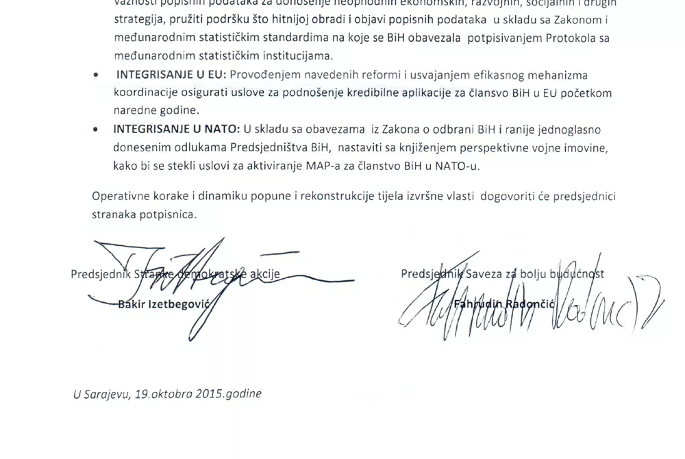 Donosimo tekst potpisanog dokumenta, a operativne korake i dinamiku popune i rekonstrukcije tijela izvršne vlasti dogovorit će predsjednici stranaka potpisnica.