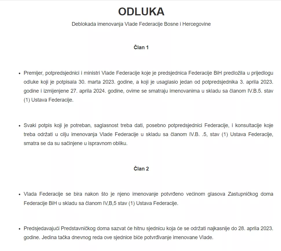 - Premijer, potpredsjednici i ministri Vlade Federacije koje je predsjednica Federacije BiH predložila u prijedlogu odluke koji je potpisala 30. marta 2023. godine, a koji je usaglasio jedan od potpredsjednika 3. aprila 2023. godine i izmijenjene 27. aprila 2024. godine, ovime se smatraju imenovanima u skladu sa članom IV.B.5. stav (1) Ustava Federacije.