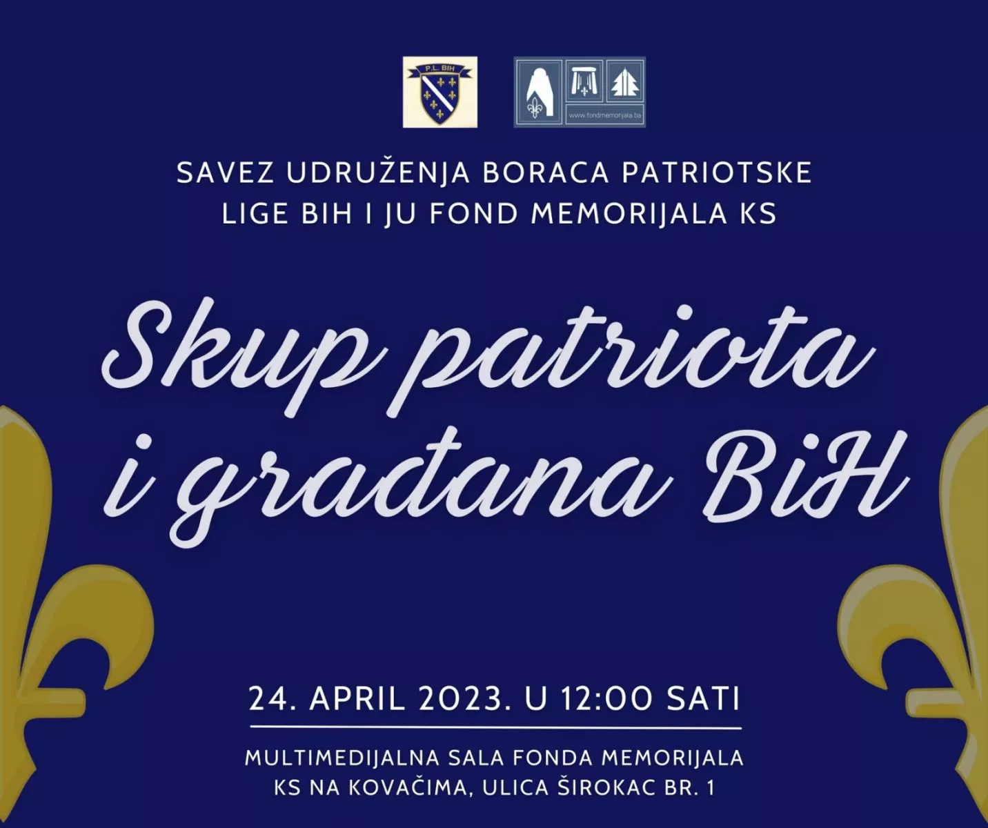 Savez udruženja boraca Patriotske lige Bosne i Hercegovine, sa drugim boračkim udruženjima, nastalim u vremenima pred agresiju na međunarodno priznatu državu Bosnu i Hercegovinu u sklopu svojih planskih aktivnost organizuje “Skup patriota i građana BiH” , 24. aprila 2023. godine u 12:00 sati u multimedijalnoj sali JU Fond Memorijala KS (ul. Širokac br. 1), na kojem će se govoriti o budućnosti Bosne i Hercegovine kroz prizmu aktuelne, političko-sigurnosne situacije, odnosno o budućnosti Bosne i Hercegovine u aktuelnom historijsko-političkom kontekstu.