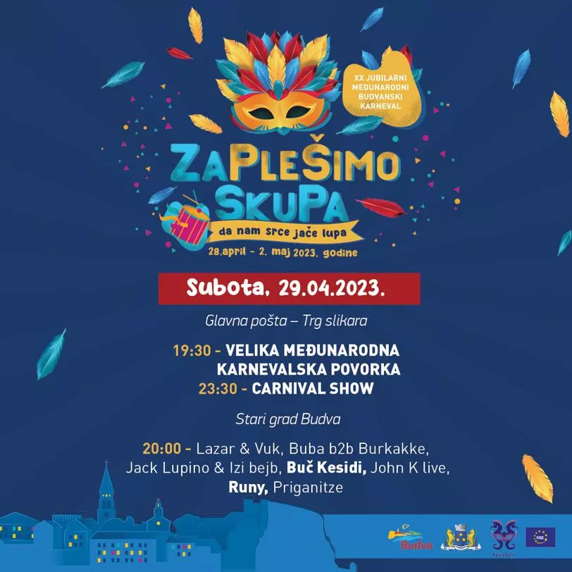 Subotu, 29. aprila, obilježit će Velika međunarodna karnevalska povorka koja polazi u 19:30h od Glavne pošte. Nakon predstavljanja više od 60 grupa na trgu ispred Starog grada slijedi Karnevalski show, specijalni performans inostranih karnevalskih grupa. Unutar Starog grada, na pjaceti kod kuće Ćekrdekovića, Trgu palmi i na platou ispred Jadranske straže, od 20:00h nastupa regionalno sve popularniji i traženiji dvojac Buč Kesidi i novosadski DJ Runy uz podršku crnogorskih DJ-eva: Lazar & Vuk („Radio Zunzar“), Buba, Burkakke i John K, kao i lokalnih bendova Jack Lupino & Izi bejb i Priganitze.