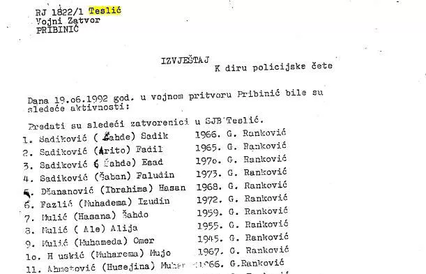 U izvještaju od 19. juna 1992. godine, sačinjen u vojnom zatvoru „Pribinić“, a koji potpisuje upravnik zatvora Dragan Babić, navodi se kako je taj dan u zatvor primljeno 16 ljudi. Sa spiska se može vidjeti da je taj dan privedeno 13 Bošnjaka i tri Hrvata.