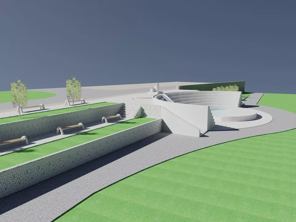 Po sredini amfiteatra će biti "potok", koji izvire iz stilizovanih ljiljana u vrhu i ponire u dnu amfiteatra te se ponovno javlja u vidu fontane u koti šetnice.