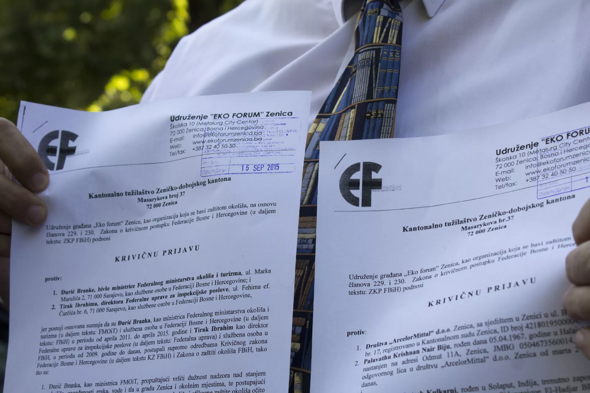ArcelorMittal i njihovi generalni direktori u Zenici Palavathu Krishnan Nair Biju i Mukund Vyankatesh Kulkarni dobili su prijavu za krivično djelo onečišćenja okoliša. Bivša Federalna ministrica okoliša i turizma Branka Đurić i Ibrahim Tirak, direktor Federalne uprave za inspekcijske poslove, suočiće se s krivičnom prijavom za nesavjestan rad u službi. Obje prijave su predate danas, na sedmu godišnjicu ratifikacije Aarhuške konvencije.