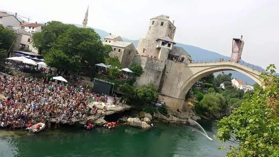 Pred nekoliko hiljada posjetilaca, prema procjenama oko 15.000 ljudi je okupiralo plato ispod Starog mosta gdje su održani akrobatski skokovi.