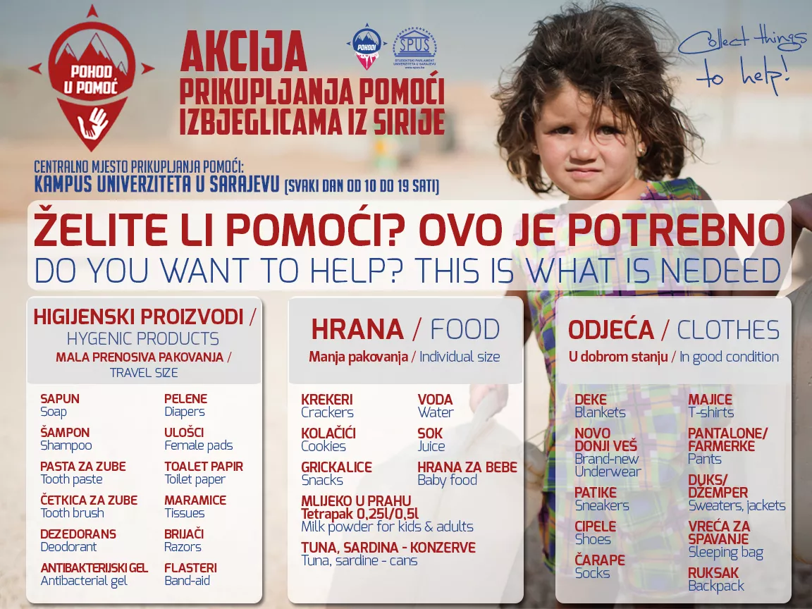 Omladinski pokret Studentski pohodi i Studentski parlament Univerziteta u Sarajevu organizuju Akciju prikupljanja pomoći za izbjeglice iz Sirije.