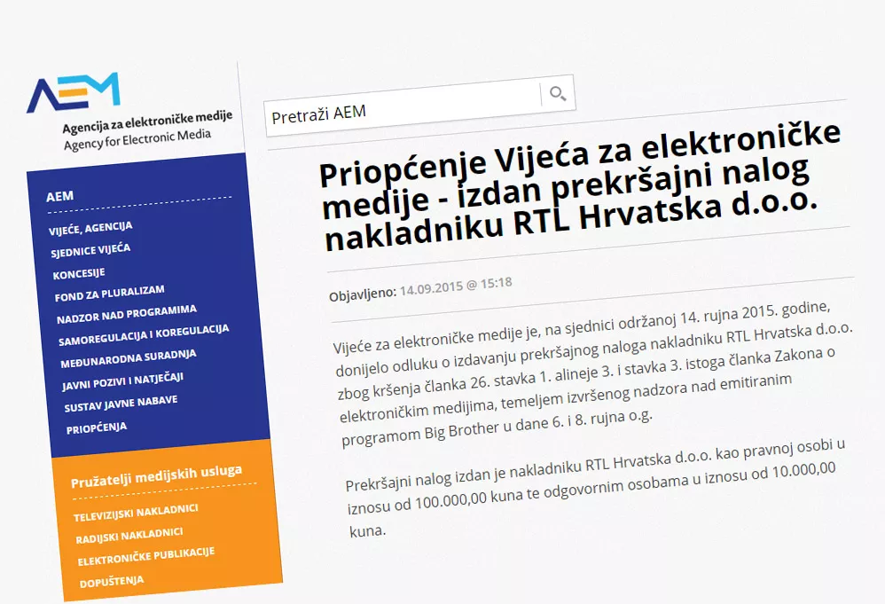 Vijeće za elektronske medije kaznilo je RTL Hrvatska sa 100.000 kuna (oko 27.000 KM) zbog prikazivanja reality showa "Big Brother", javljaju hrvatski mediji, prenosi novinska agencija Patria. Sa po 10.000 kuna kažnjene su odgovorne osobe u RTL Hrvatske.
