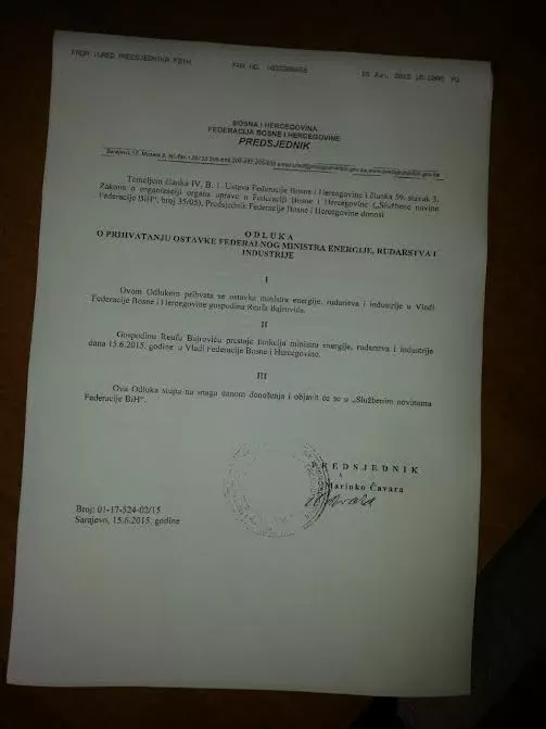 Predsjednik Federacije BiH Marinko Čavara potpisao je jutros Odluku o prihvatanju ostavke četvoro federalnih ministara iz Demokratske fronte, piše novinska agencija Patria.