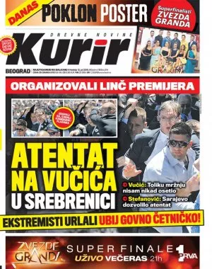 Očekivano, naslovne strane srbijanskih medija danas su posvećene incidentu u Potočarima. Isto tako očekivano naslovi su da je bio "linč Vučića", "atentat na Vučića", a neki su otišli dotle da su krivcem za napad proglasili pripadnike elitne jedinice Armije RBiH danas okupljene oko Udruženja Crni labudovi, piše novinska agencija Patria.