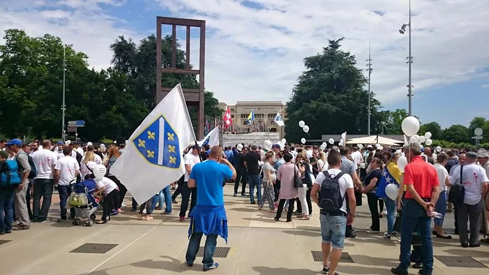 Okupljeni građani na Trgu ispred zgrade UN-a u Ženevi pustili su u zrak hiljade bijelih balona sa porukom "Genocide de Srebrenice juillet 95" (Genocid u Srebrenici juli 95), piše bh. novinska agencija Patria.