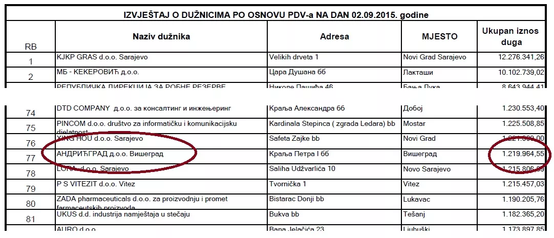 Firma „Andrićgrad“ se nalazi i na 77. mjestu liste najvećih dužnika PDV-a Uprave za indirektno oporezivanje s dugom koji danas iznosi 1.255.521,55 KM. Iznos duga se svakog dana mijenja zbog obračuna zateznih kamata tako „Andrićgrad“ trenutno ima glavni dug od 1.068.369,55 KM i zatezne kamate od 187.152,00 KM.