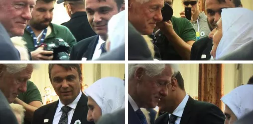 10:20 Majke Srebrenice i okupljeni ispred Fabrike akumulatora u Potočarima dočekali su Bila Klintona aplauzom. Munira Subašić uručila je dar Klintonu, uz poruku da ponese svojoj supruzi "budućoj predsjednici SAD".