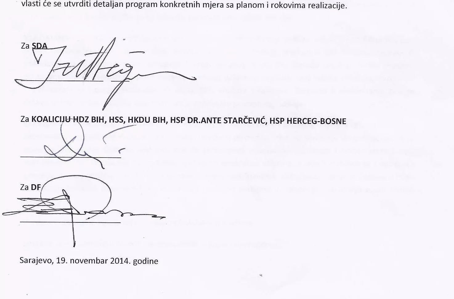 Stranka demokratske akcije (SDA), Demokratska fronta (DF) i Hrvatska demokratska zajednica (HDZ), odnosno lideri ovih stranaka potpisali su sporazum o zajedničkom djelovanju u vlasti na svim nivoima, kao i ciljevima buduće vlasti.