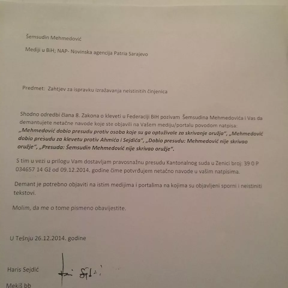 Kako je tada saopćeno iz kabineta zastupnika u PS BiH, Šemsudina Mehmedovića, on je dobio presude protiv Muharema Ahmića i Harisa Sejdića za iznošenje i prenošenje neistinitih činjenica, odnosno za klevetu.