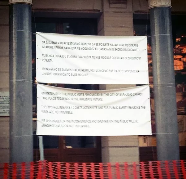 - Sa žaljem obavještavamo javnost da se posjete najavljene od strane Gradske uprave Sarajeva ne mogu održati danas, ali ni u skoroj budućnosti. Vijećnica ostaje u statusu gradilišta i nije moguće osigurati bezbijednost posjeta. Izvinjavamo se za eventualne neprilike i učinit ćemo sve da se otvorenje za javnost objavi što je moguće prije.“