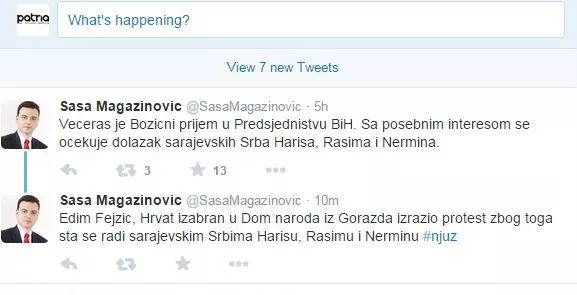 - Večeras je Božićni prijem u Predsjedništvu BiH. Sa posebnim interesom se očekuje dolazak sarajevskih Srba Harisa, Rasima i Nermina - napisao je Magazinović.