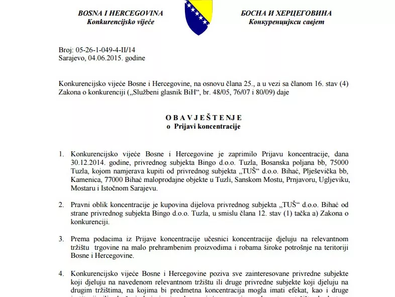 Tuzlanski Bingo još 30. decembra 2014. godine uputio je Konkurencijskom vijeću BiH Prijavu koncentracije kojom namjerava od privrednog subjekta Tuš d.o.o. Bihać, kupiti maloprodajne objekte u Tuzli, Sanskom Mostu, Prnjavoru, Ugljeviku, Mostaru i Istočnom Sarajevu, piše bh. novinska agencija Patria.