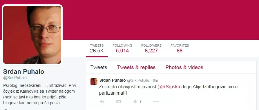 - Zelim da obavjestim javnost @RSrpska da je Alija Izetbegovic bio u partizanima!!! - napisao je Puhalo, prenosi bh. novinska agencija Patria.