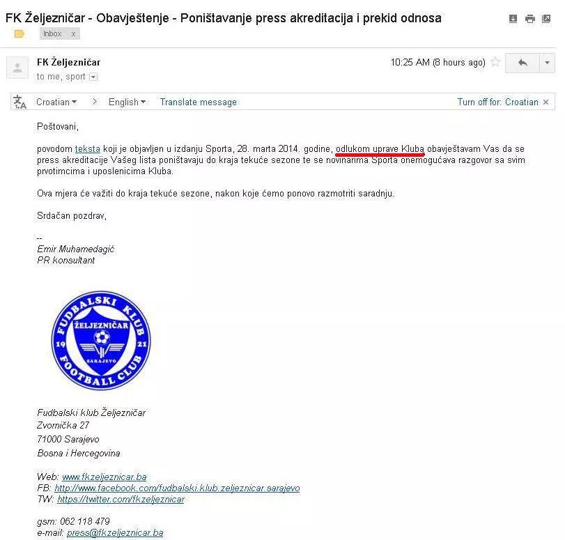 FK Željezničar uradio je neobičan potez nezapamćen u novijoj historiji sporta. Naime, novinarima Avazovog „Sporta“ zabranili su ulazak na stadion Grbavica do kraja sezone!?