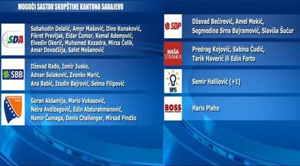 Prema dosadašnjim pojedinačnim glasovima ( iz stranačkih izbornih štabova) kandidata pet stranaka koje su prešle izborni prag u sastavu Skupštine Kantona Sarajevo bit će 11 zastupnika SDA, SBB i DF po sedam, četiri SDP-a, tri iz Naše stranke, dva BPS-a i jedan iz BOSS-a, piše bh. novinska agencija Patria.