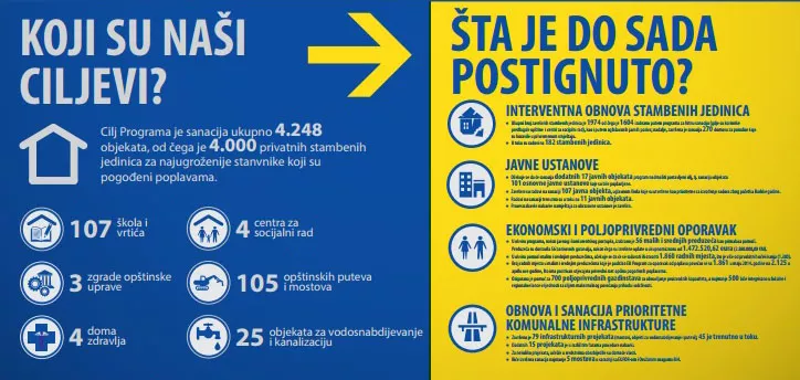 Obnovljeno je 107 škola, a radovi na 11 njih su u toku. Više od 117 javnih ustanova je obnovljeno koje su bile poplavljene.