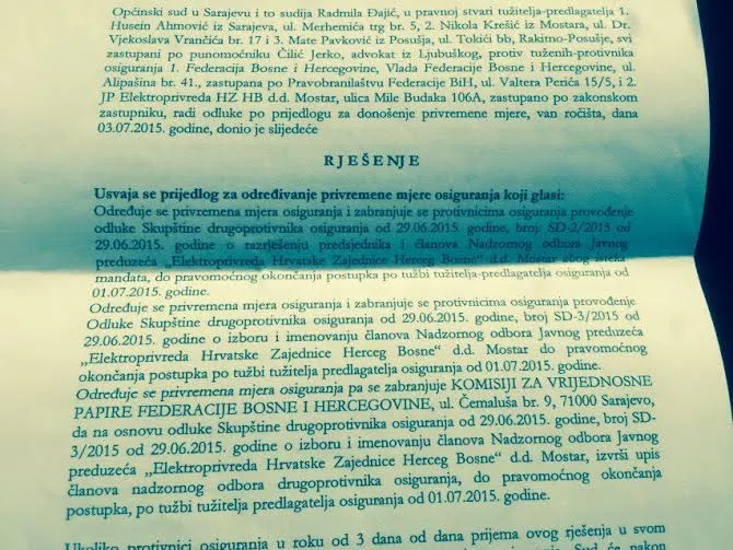 Općinski sud u Sarajevu donio je danas Rješenje o privremenoj mjeri osiguranja kojom zabranjuje provođenje odluke Skupštine Elektroprivrede HZ HB od 29. juna o razrješenju predsjednika i članova Nadzornog odbora ove Elektroprivrede, piše novinska agencija Patria.