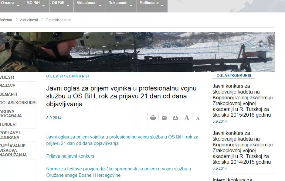 Ministarstvo odbrane BiH raspisalo je javni poziv za prijem vojnika u profesionalnu službu u Oružane snage BiH. Iz reda bošnjačkog naroda potrebno je 28 vojnika, iz reda srpskog naroda 91, hrvatskog 16 i reda Ostali 1. Kako se navodi u pozivu potrebna je srednja stručna sprema (SSS) III i IV stepena, piše bh. novinska agencija Patria.