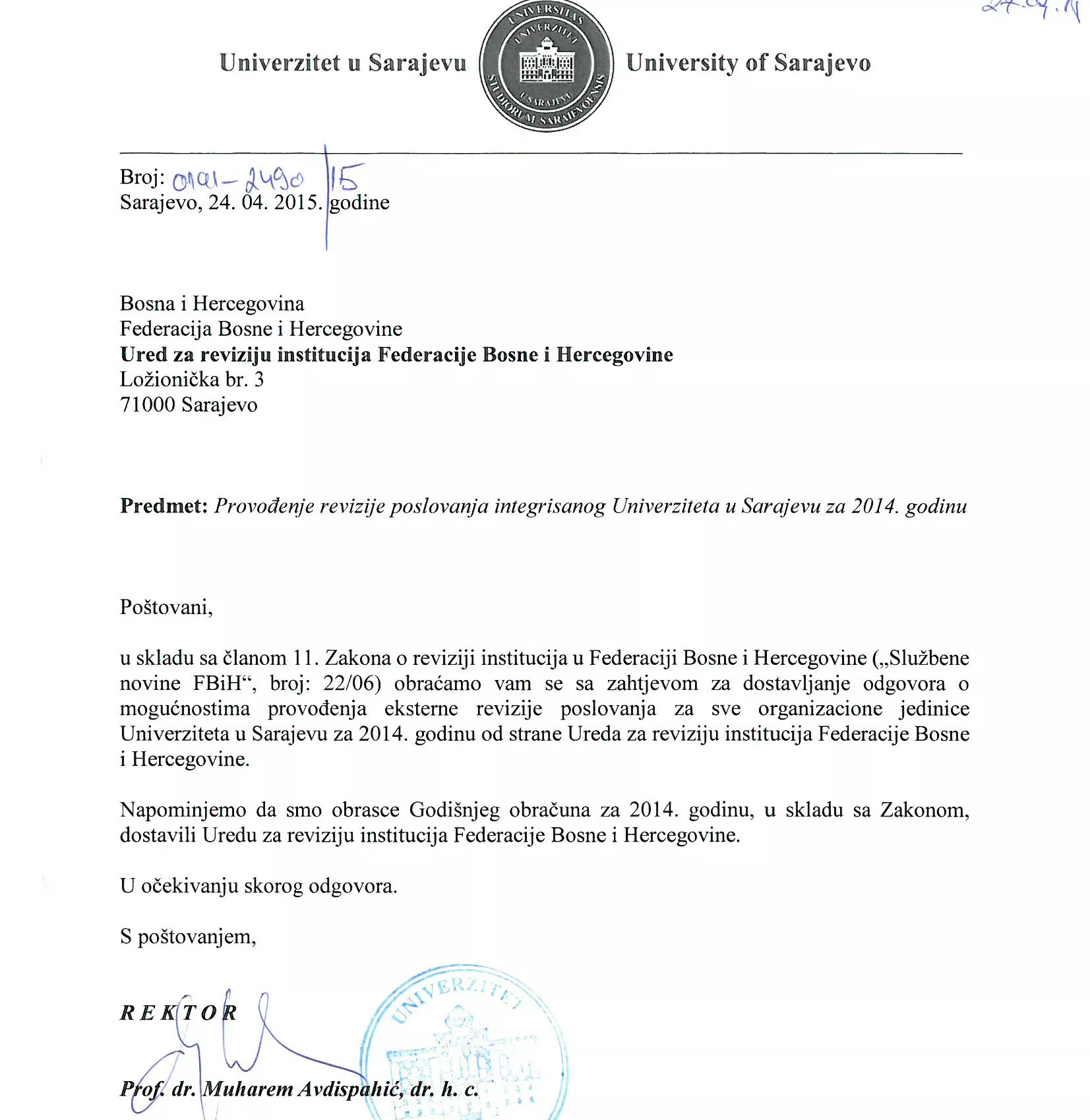 U dopisu koji su poslali Uredu za reviziju institucija FBiH 24. aprila 2015. godine UNSA je zatražio provođenje eksterne revizije poslovanja za sve organizacione jedinice UNSA za 2014. godinu.