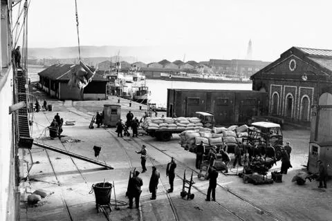 Crno-bijela fotografija, kako navode novinari, nastala je u februaru 1958. godine. Na fotografiji se vidi istovar vreća sa velikog broda usidrenog u luci.